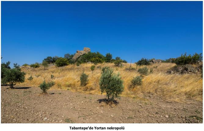 Yortan höyüğü diye anılan Tabantepe, kayalık bir tepe olup gerçek bir höyük değildir. Burası büyük bir nekropoldür (mezarlık). Yörede, bu kadar büyük bir mezarlığa sahip olabilecek bir yerleşim alanı bulunamamıştır. Bir teoriye göre bu nekropol çevredeki çok sayıda yerleşimin ortak mezarlık alanı olabilir. 200 metre kadar yakındaki Değirmentepe bir nekropol değildir. Üzerinde bulunan çanak çömlek parçaları buradaki olası bir yaşamın izleri olarak düşünülmektedir.