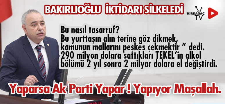 Ama siz ne yapıyorsunuz? Hurda araçları ‘yük’ görüyorsunuz, ama milyonluk makam araçlarından tek bir adım geri atmıyorsunuz. Hazine ve Maliye Bakanlığı’” ifadelerini kullandı. Kupon araziler ‘ihtiyaç fazlası’ oldu! Asıl büyük tehlikenin kamu arazilerinde yaşandığını vurgulayan Bakırlıoğlu, TBMM Genel Kurulu’nda görüşülmekte olan kanunun içindeki 11. Maddesinde yer alan, özellikle kıyı bölgeleri ve rant değeri yüksek alanların Özelleştirme İdaresi eliyle satışına işaret ederek şunları söyledi: “Devletin en kıymetli, en stratejik, halkın ortak malı olan kupon arazilerini de ‘ihtiyaç fazlası’ diye satışa çıkarıyorsunuz. Bu araziler ihtiyaç fazlası değil, bu milletin geleceğidir! Bir yanda hurda araçları elden çıkarıyormuş gibi tasarruf görüntüsü veriyorsunuz, diğer yanda milyarlarca liralık kamu varlıklarını peşkeş çekiyorsunuz. Bugün Türkiye’de ‘tasarruf’ adı altında yürütülen politikalar maalesef gerçeği yansıtmıyor. Elinizde çalışmayan, motoru dağılmış, sanayiden çıkamayacak hale gelmiş araçlar var. Lüks makam araçlarınız ihtiyaç fazlası olarak görmüyor, bu hurdaları ihtiyaç fazlası sayıyorsunuz. Peki soruyorum: Bu araçlar zaten kamuya yük haline gelmiş, kullanılamaz hale gelmiş. Bunları Bugün kamu kurumlarının önüne gidin bakın; milyonlarca liralık makam araçları, israfın sembolü haline