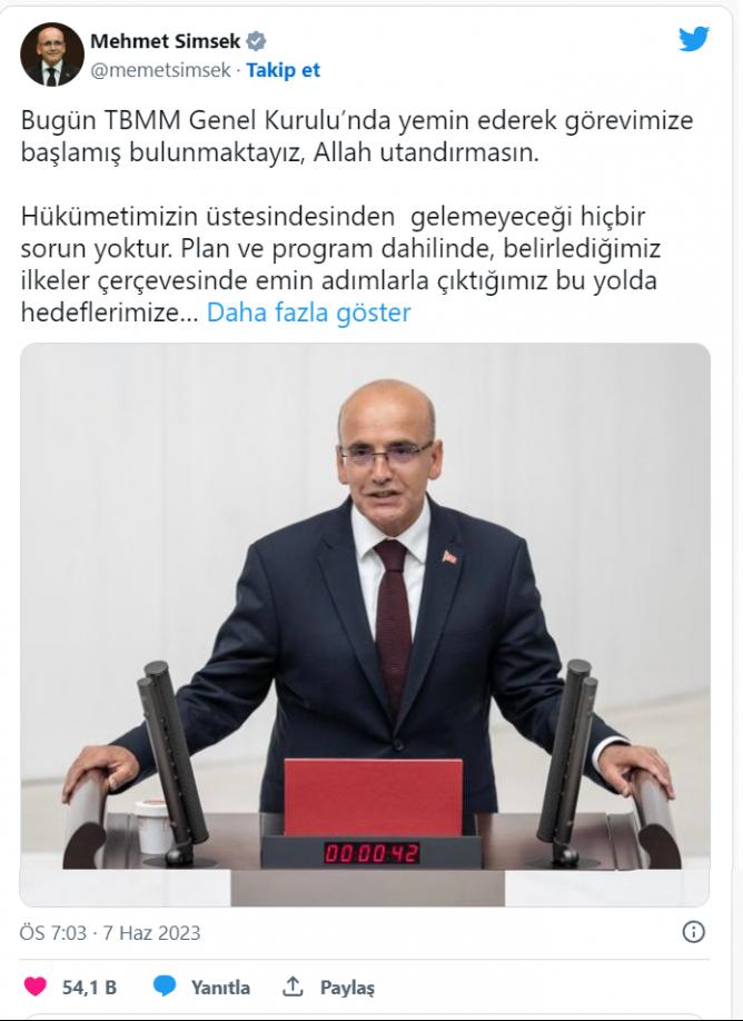 Hazine ve Maliye Bakanı Mehmet Şimşek, sosyal medya hesabından yaptığı paylaşımda, "Sabır ve zamana ihtiyacımız var" dedi. Şimşek, "Hükümetimizin üstesinden gelemeyeceği hiçbir sorun yoktur. Plan ve program dahilinde, belirlediğimiz ilkeler çerçevesinde emin adımlarla çıktığımız bu yolda hedeflerimize inşallah herkesin desteğini alarak ulaşacağı" ifadelerini kullandı.