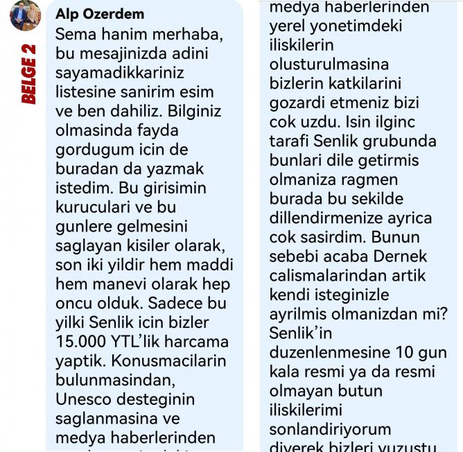 Alp Özerdem isimli kişi mesajı yazanın Sema isimli bir hanımfendi olduğunu yazıp, kendisi ve eşinin orada, teşekkür edilenler arasında olmayışına kendince haklı sebepler sunuyor. “Bu girişimin kuruculari ve bu günlere gelmesini sağlayan kişiler olarak oncu olduk. Sadece bu yilki Senlik için bizler 15.000 YTL’lik (acaba yıllar önce ‘YTL’nin tedavülden kaldırıldığını bilmiyor mu yazan kişi. Ülkesinden çok haberdarmış anlaşılan) harcama yaptık. Konusmacilarin bulunmasindan, Unesco desteğinin saglanmasina ve medya haberlerinden yerel yönetimdeki ilişkilerin olusturulmasina bizlerin katkilarini gozardi etmeniz bizi çok uzdu” [Yazım ve dil hataları yazanın kendisine aittir] diyerek Sema hanımfendi’nin neler yaptığını yazarak devam ediyor. Buradan da anlaşılıyor ki bizim bilmediğimiz şeyler olmuş.