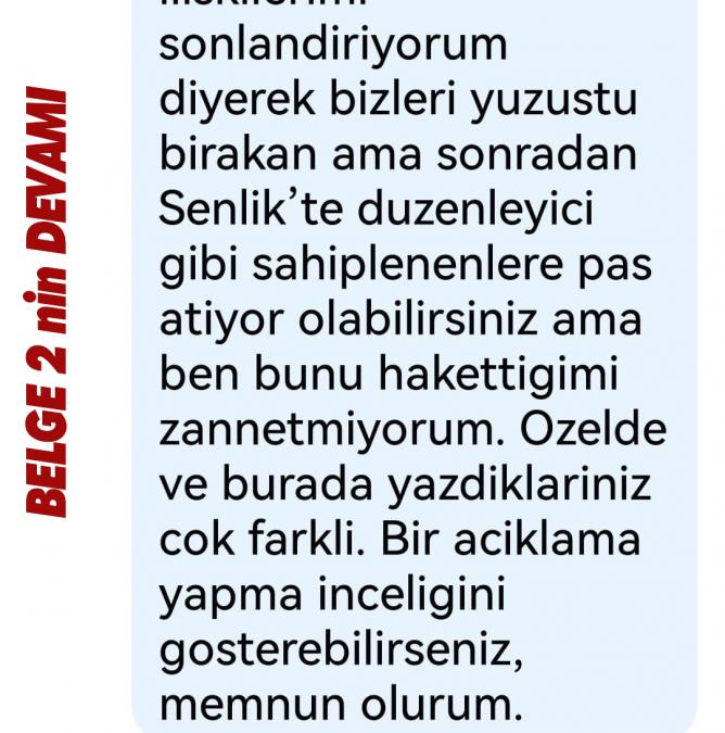 M.Güneş – 2. Belgeye baktığım için biliyorum, bunu yazan kişi bir sonraki resimde de anlaşıldığı gibi (Sema hanımfendi) 2 kişi yi yok sayarak bir teşekkür mesajı vermiş. Sebep çok açık, gerçekleştirilen bir etkinlik adına (kendisi ‘Senlik’ diyor) destek bulduğu kurum ve kişilere yapılan bir teşekkür var burada. Ama bu etkinlikleri düzenleyen derneğin her şeyini kendisinin yaptığını, hem de 15.000 YTL. (gerçi biz YTL yi kullanmayalı neredeyse 10 yılı geçti) para harcadığını söyleyerek sitem etmiş. Ve bu konuda bir açıklama istemiş. Teşekkür edilmemesi hakkında bir açıklama görmediğinden olsa gerek, bunun bir bedeli olarak kendi deyimleri ile ‘Senligin’ hayata geçirilmesinde katkıları olan iki kişinin yerine, yeni gönüllüler (!) aradığını duyurarak kendi istekleri ile ayrıldıklarını duyurmuş.