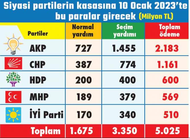 İktidara söylenecek tek söz var "yolunuz açık olsun"... Tevfik Fikret'in "Han-ı Yağma" şiiriyle isteyen devam edebilir. Kamuoyun da ana muhalefetin dağınıklığına, parçalanmışlığına çok söz ediliyor. Genel Başkanının koltuğa bağlanmışcasına sarılmasından tutun partinin milyonlarına çöküldüğüne kadar... Siyasi partiler hazineden hatırı sayılır miktarda paralar alır. Aşağıda bunu gösteren (Mayıs 2023 Genel Seçimleri için) tabloya bakınız.