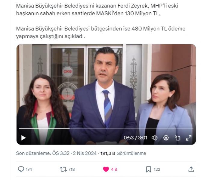 MHP li Manisa Belediyesi eski başkanı usulsüz ödeme yapmak istedi, ancak belediye bürokratları buna imza atmadılar. Manisa Büyükşehir Belediye Başkanı Ferdi Zeyrek X hesabından olayı şöyle anlattı; " 5 yıldır görevde olan belediye başkanı saat 10.30 da belediyeye geliyor, belediyenin kasasında bulunan paraları başkalarının hesabına göndermek istiyor. MASKİ den 130 milyon tl. belediyenin kasasından da 480 milyon tl. karşı tarafa ödeme yapmak istiyor. Bu ödeme için Mali İşler Daire Başkanı imza atmıyor. Dik duruşundan dolayı kendisini tebrik ediyorum." dedi