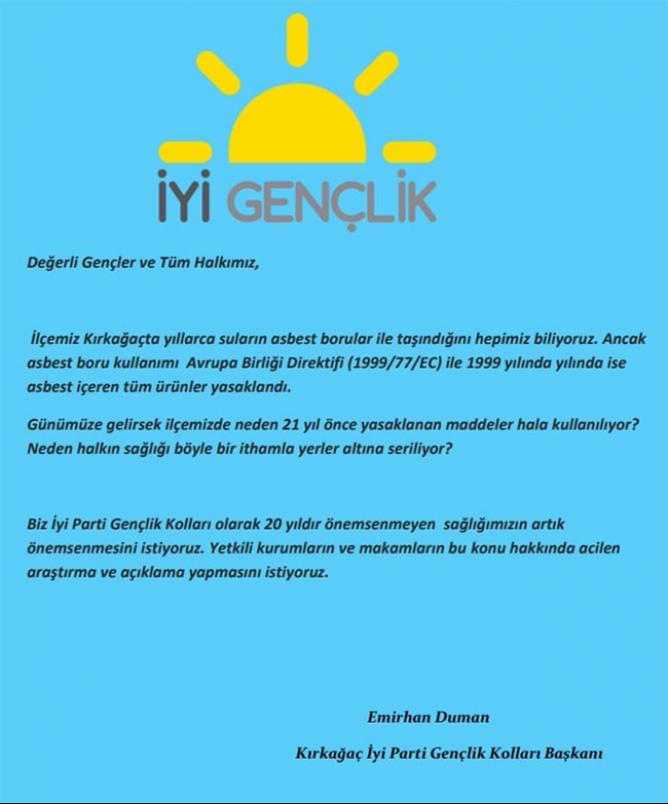 Halk sağlığı ile ilgili bu önemli konuda günlerdir açıklama bekleyenler, ne yazık ki Eski Başkan Sayın Rıza Kayadipli'den sonra, İyi Parti Gençliğinden gelen sesle yetinmek durumunda kalıyor. Oysa Kırkağaç içme sularının söylendiği gibi zehir saçan borularla mı taşınıp taşınmadığı konusun da Büyükşehir yetkilileri Kırkağaç'lılara açıklama yapmak zorundalar. Kamuoyunun sağlığı ile yakından ilgili bu konu Kırkağaç'ta herşeyden önce ele alınması gerekmez mi? Prestij yolu yapılıyor ancak musluklardan akan suyun içeriğini bilmiyor... Halk adına hizmet üreten kurumları bu konu ilgilendirmiyor mu? İlçe sağlık müdürlüğümüz bu konuda açıklama yapmaz mı? Konuya dair İyi Gençlik aşağıdaki açıklamayı gönderdi. Değerli Gençler ve Tüm Halkımız, İlçemiz Kırkağaçta yıllarca suların asbest borular ile taşındığını hepimiz biliyoruz. Ancak asbest boru kullanımı Avrupa Birliği Direktifi (1999/77/EC) ile 1999 yılında yılında ise asbest içeren tüm ürünler yasaklandı. Günümüze gelirsek ilçemizde neden 21 yıl önce yasaklanan maddeler hala kullanılıyor? Neden halkın sağlığı böyle bir ithamla yerler altına seriliyor? Biz İyi Parti Gençlik Kolları olarak 20 yıldır önemsenmeyen sağlığımızın artık önemsenmesini istiyoruz. Yetkili kurumların ve makamların bu konu hakkında acilen araştırma ve açıklama yapmasını istiyoruz. Emirhan Duman Kırkağaç İyi Parti Gençlik Kolları Başkanı