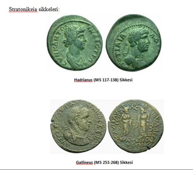 Stratonikeia kentinden sikkeleri dışında günümüze pek az şey ulaşmıştır. Bunların en önemlisi kuşkusuz, Yağmurlu Köyü’nde bulunan ve şimdi Manisa Müzesi’nde korunan (Env.No 101) Hadrianus’un MS.127 yılında Stratonikeia’ya yazdığı üç mektubu kaydeden bir mermer steldir. Bu arada yine aynı köyde bulunan ve yine Manisa Müzesi’nde korunan (Env.No 269), Roma İmparatoru Antoninus Pius’a sunduğu anlaşılan bir adak (MS 137-161) Stratonikeia ve bölge tarihi açısından önemli bir buluntudur. Bu arada, Siledik’te ve Hamitli’de bulunan, Roma imparatorluk dönemine ait bazı mezar taşları bugün Manisa Müzesi’nde ya da bazı özel kolleksiyonlarda yer almaktadır. Yine de yörede, Stratonikeia kentine ait diğer bazı buluntulara rastlamak mümkündür. (Örneğin bir ara Kırkağaç Hükümet Konağı önünde bulunan ve civar köylerin mezarlıklarındaki birkaç Grekçe yazıt ve Bizans Devri’ne ait bazı mimari buluntular gibi.)