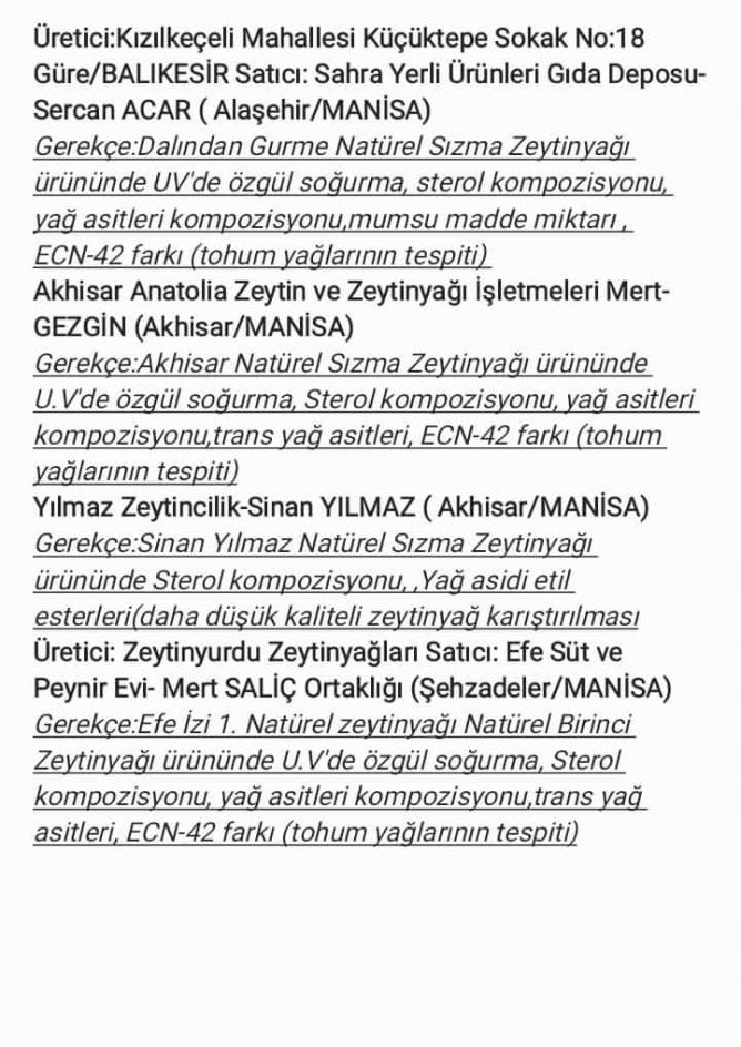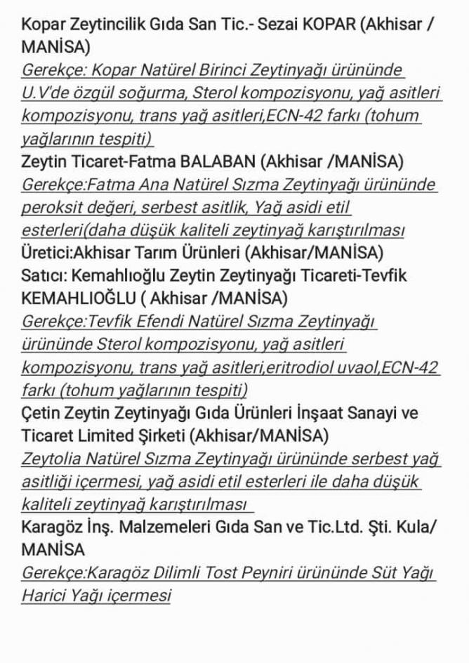 Ancak buna rağmen bu firmalara yaptırımlar yetersiz seviyede olduğu için tamamı da yüzünüze baka baka hilelere devam ediyor. Sizin için paylaşılan gıda analizlerinde Manisa da sizi kandıran, suç işleyen ve cezalandırılması gereken firmaların listesini paylaşıyorum. Yorum yapmak istemiyorum her şey ortada takdir sizin. Bu gıdaları tüketip hilecilere para kazandırmaya devam edecekmisiniz? Yoksa devletin cezalandırmadığı hilecileri tüketmeyerek siz mi cezalandıracaksınız. Buyrun arkadaşlar işte tüm listeden seçtiğimiz Manisa'da tespit edilen firmalar (üzgünüz ki o listede Kırkağaç'ta var) İşte o liste: