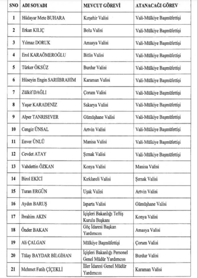 19 Eylül 2024 tarihli yayınlanan, Valiler Kararnamesi ile 16 ilin valisi değiştirildi. 12 ile yeni vali ataması yapılırken, 4 ilin valisi yer değiştirdi. 12 ilin valisi mülkiye başmüfettişi olarak merkeze alındı. Kararname ile Hüdayar Mete Buhara, Erkan Kılıç, Yılmaz Doruk, Erol Karaömeroğlu, Türker Öksüz, Hüseyin Engin Sarıibrahim, Zülkif Dağlı, Yaşar Karadeniz, Alper Tanrısever, Cengiz Ünsal, Enver Ünlü ve Cevdet Atay 'vali-mülkiye başmüfettişliği' görevine getirildi. Vahdettin Özkan Manisa olurken AA değişen tabloyu aşağıdaki gibi servis etti.