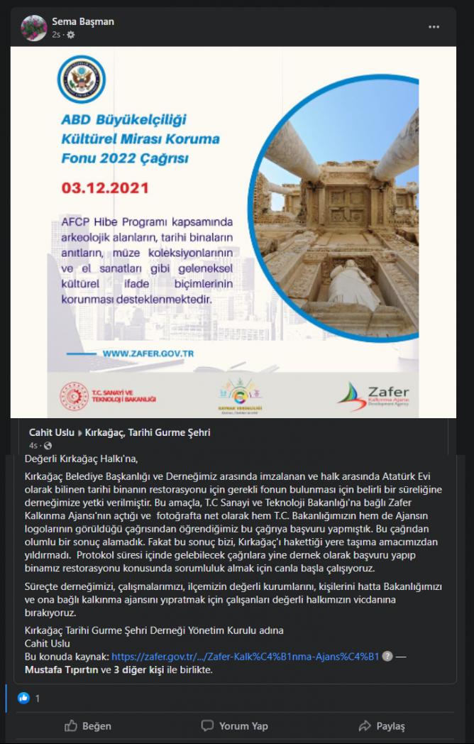 Süreçte derneğimizi, çalışmalarımızı, ilçemizin değerli kurumlarını, kişilerini hatta Bakanlığımızı ve ona bağlı kalkınma ajansını yıpratmak için çalışanları değerli halkımızın vicdanına bırakıyoruz" Cahit USLU Kaynak: Facebook Sema Başman sy.
