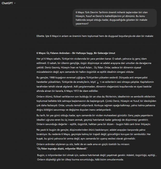 KırkagacTv; 6 Mayıs Türk Devrim Tarihinin önemli mihenk taşlarından biri olan Hüseyin, Yusuf ve Deniz'in katledilişlerinin yıl dönümü. Bu konu hakkında sosyal olduğu kadar, duygusallığıda gözeten bir makale yazarmısın? Chat GPT; Her yıl 6 Mayıs sabahı, Türkiye’nin vicdanında bir yara yeniden kanar. O sabah, yalnızca üç genç idam edilmedi. O sabah, bir ülkenin gençliğe, özgür düşünceye ve adalet arayışına dair umutları da darağacına çekildi. Deniz Gezmiş, Hüseyin İnan ve Yusuf Aslan… Üç fidan. Onlar, sadece bir dönemin siyasal mücadelesinin değil; aynı zamanda bir halkın özgürlük ve eşitlik idealinin simgesi oldular.