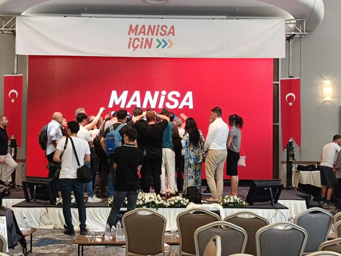 31 Temmuz 2024 tarihli “MANİSA İÇİN YENİ MANİFESTO” başlığında yapılan toplantıdan sonra basın açıklaması için kurulan stant, önce konukların ikram aldıkları salonda kuruldu. Şaşaası kendinden fiyakalı malum basın, önce oraya kurdu kameralarını, sonra toplantı salonunda ki sahneye çekildi.